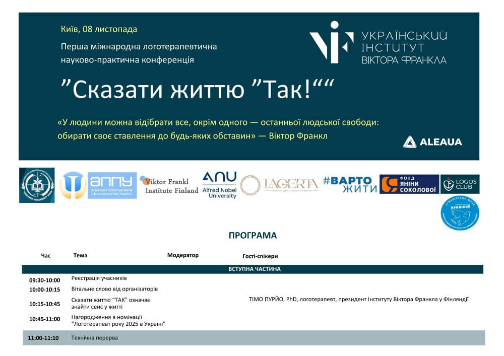 Перша Міжнародна логотерапевтична науково-практична конференція «Сказати життю «Так!»» 8 листопада 2025 року в Україні відбулася Перша Міжнародна логотерапевтична науково-практична конференція